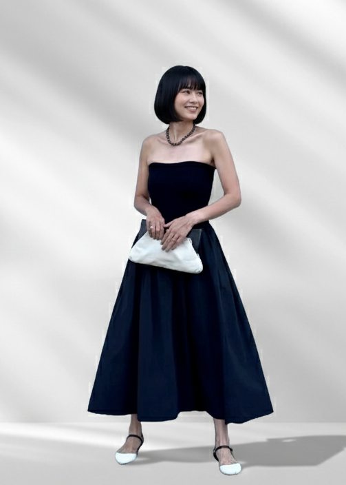 肩紐は取り外し可能。身頃の上端にはソフトゴムが入っているのでベアワンピとして着用した際にもずり落ちる心配はありません。