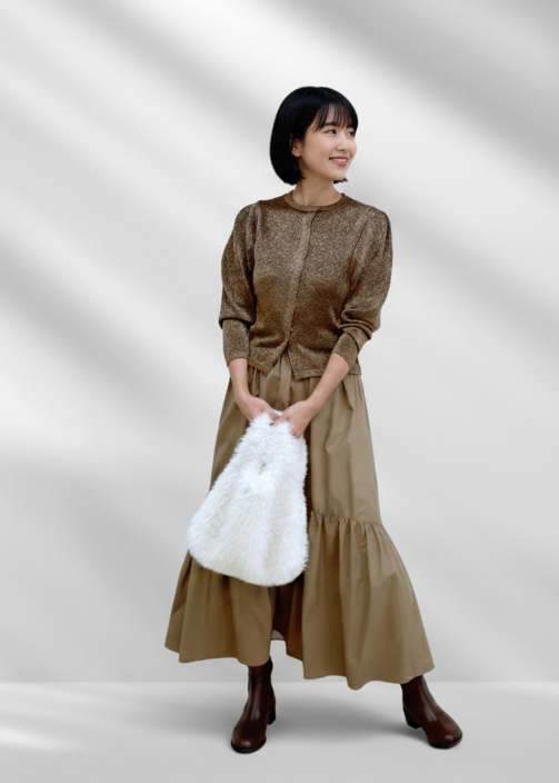 休日イベントやランチ、忘年会などほんのり華やぎたいときにおすすめなラメカーディガン。